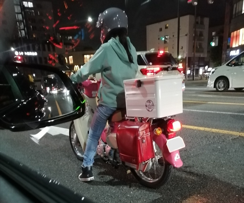 ピンク色のカブに赤いランドセルを装備したバイクを見かけました。こういうの嫌いじゃないんです。面白い!